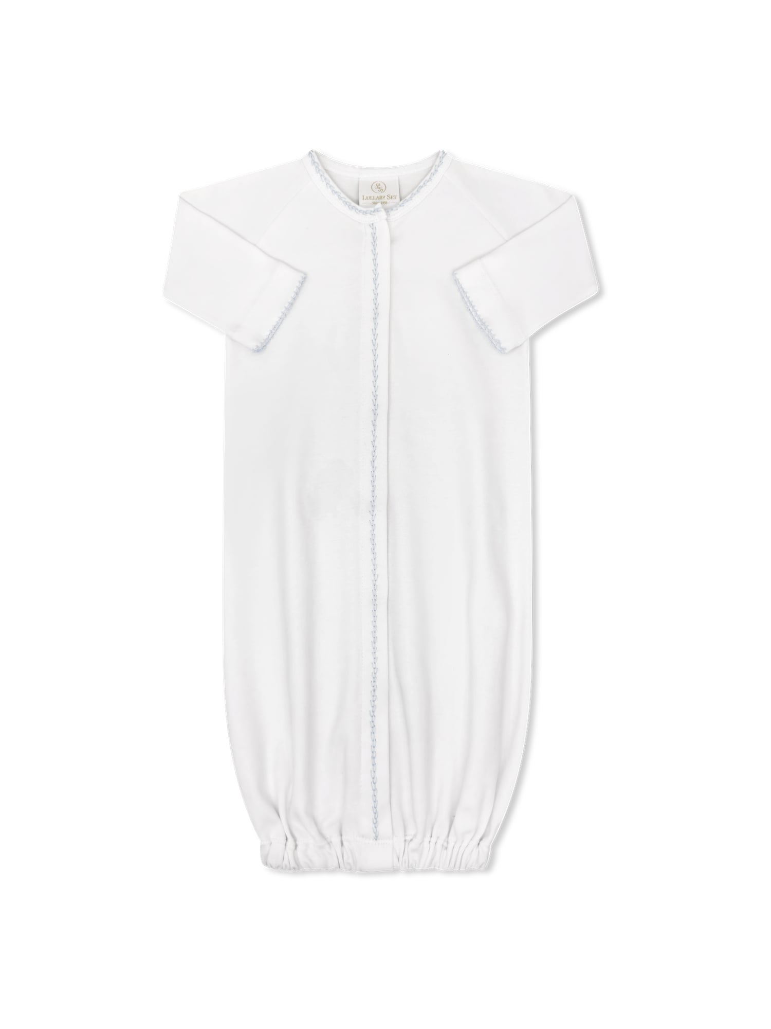 The Snuggle Me Saque Gown in Park White knit with blue featherstitching and picot trim to give it an elegant touch. Designed for ease and comfort, the gown provides a snug fit while allowing room for movement, making it ideal for nap time or special moments.