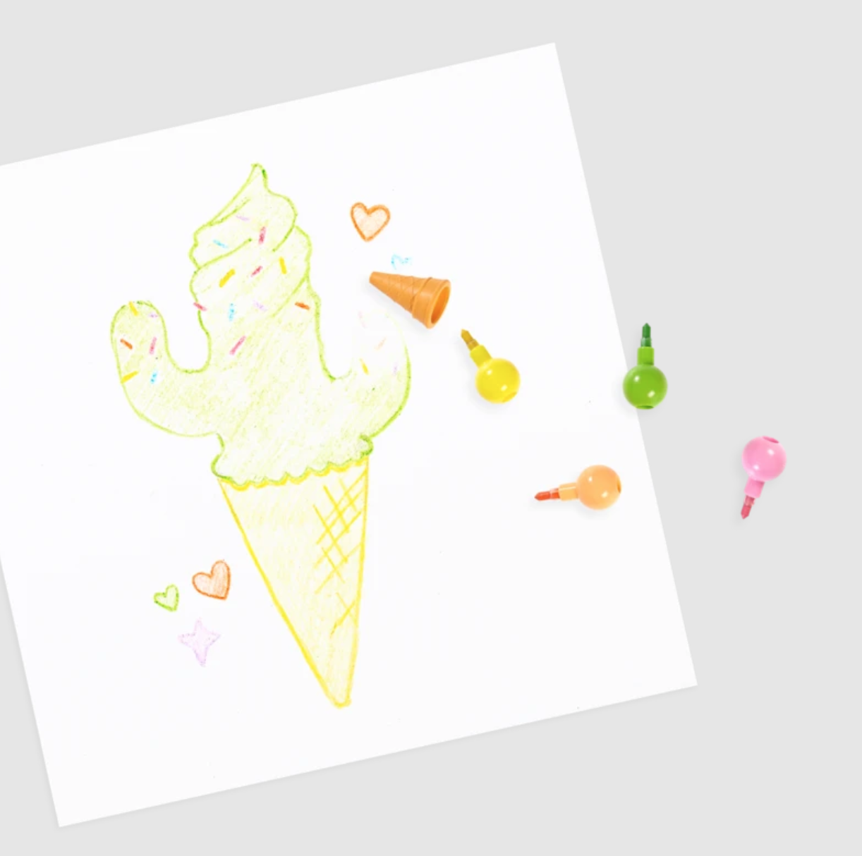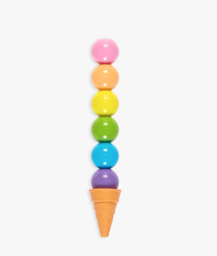 Rainbow Scoops Stacking Erasable Crayons are ice cream cone shaped stackable crayons. Each of the 6 ice cream scoops has a single colored fine tip erasable crayon and is totally interchangeable from the rest. The cone is a vanilla scented eraser! Stack them any way you like!