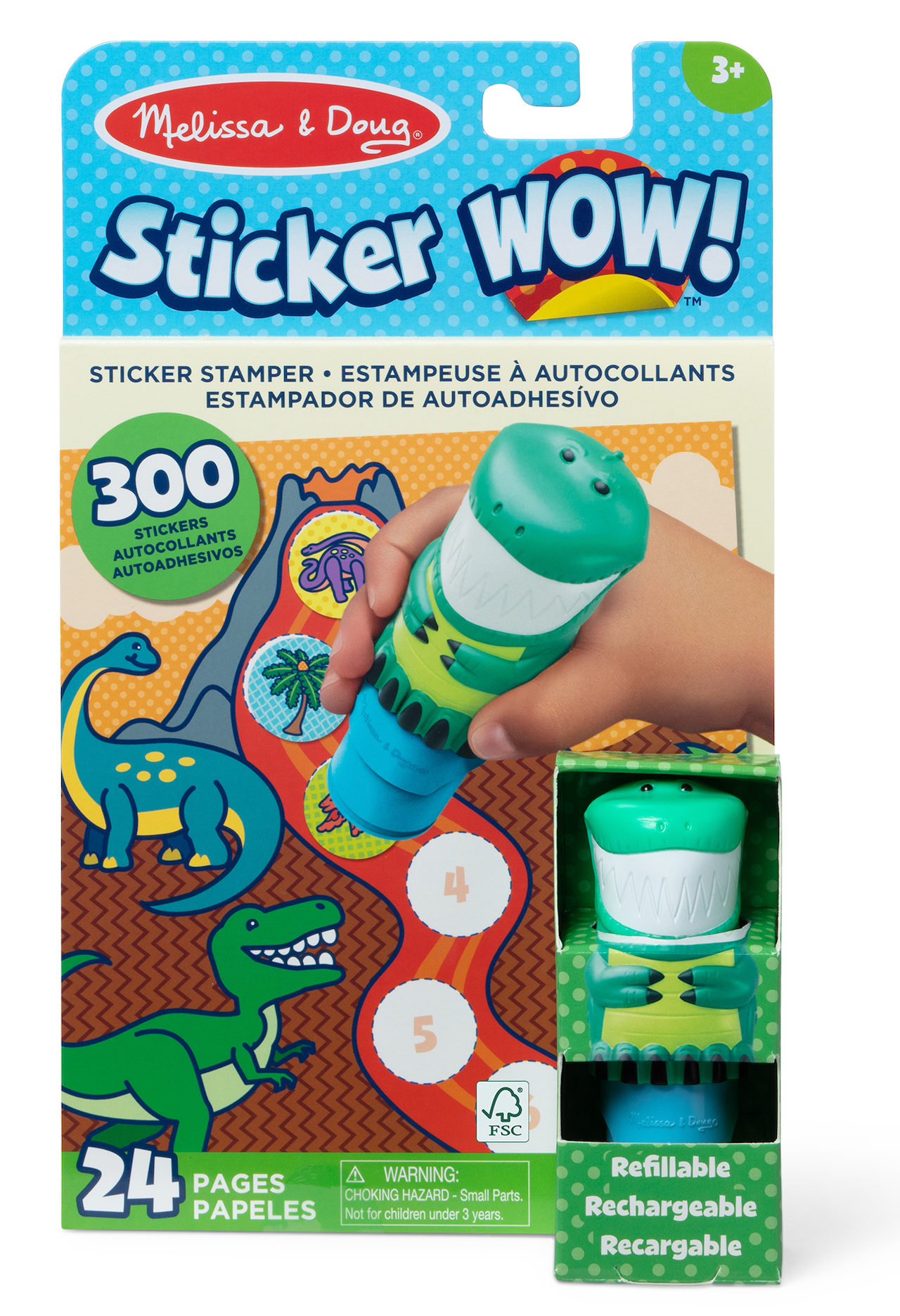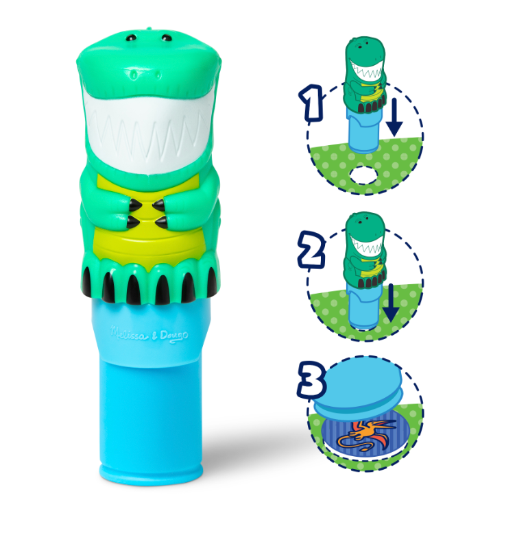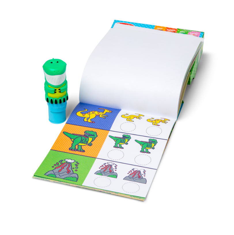 Melissa & Doug Sticker WOW! is a whole new way to play with stickers! Let the adorable, collectible Olive the Dinosaur stamp, stamp, stamp its way through 24 pages of fun filled, prehistoric themed counting, matching, and search and find activities. The refillable sticker stamper comes pre loaded with a sticker stack of 300 assorted stickers with 100 unique designs in every stack, each sticker is a surprise! Themed refill packs are sold separately and are compatible with any Sticker WOW! sticker stamper. Stickers are not reusable, but are easy to remove if necessary. Fill in the activity pages and use for creative art projects, such as bookmarks, posters, cards, and more. Easy to remove stickers and the convenient on the go format with built in sticker stamper storage makes Sticker WOW! a great mess free travel activity
