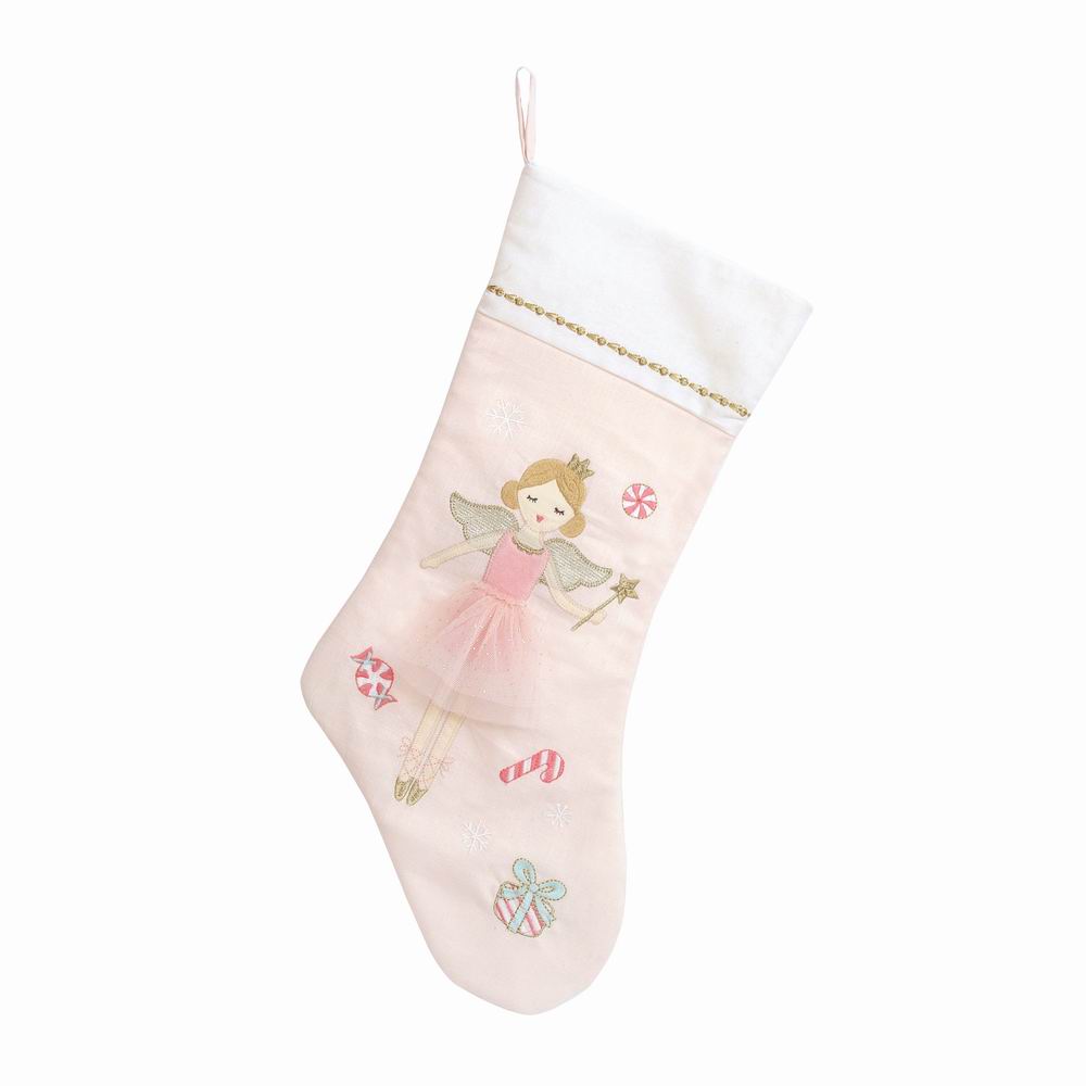 This festive Sugar Plum Fairy Stocking in pretty pink is beautifully detailed with the magical fairy from The Nutcracker. Generously sized for plenty of presents, this linen stocking features a wide monogrammable hem to make it truly personal. A durable loop makes it easy to hang on a fireplace, staircase or bookcase. Measures 15 x 21".