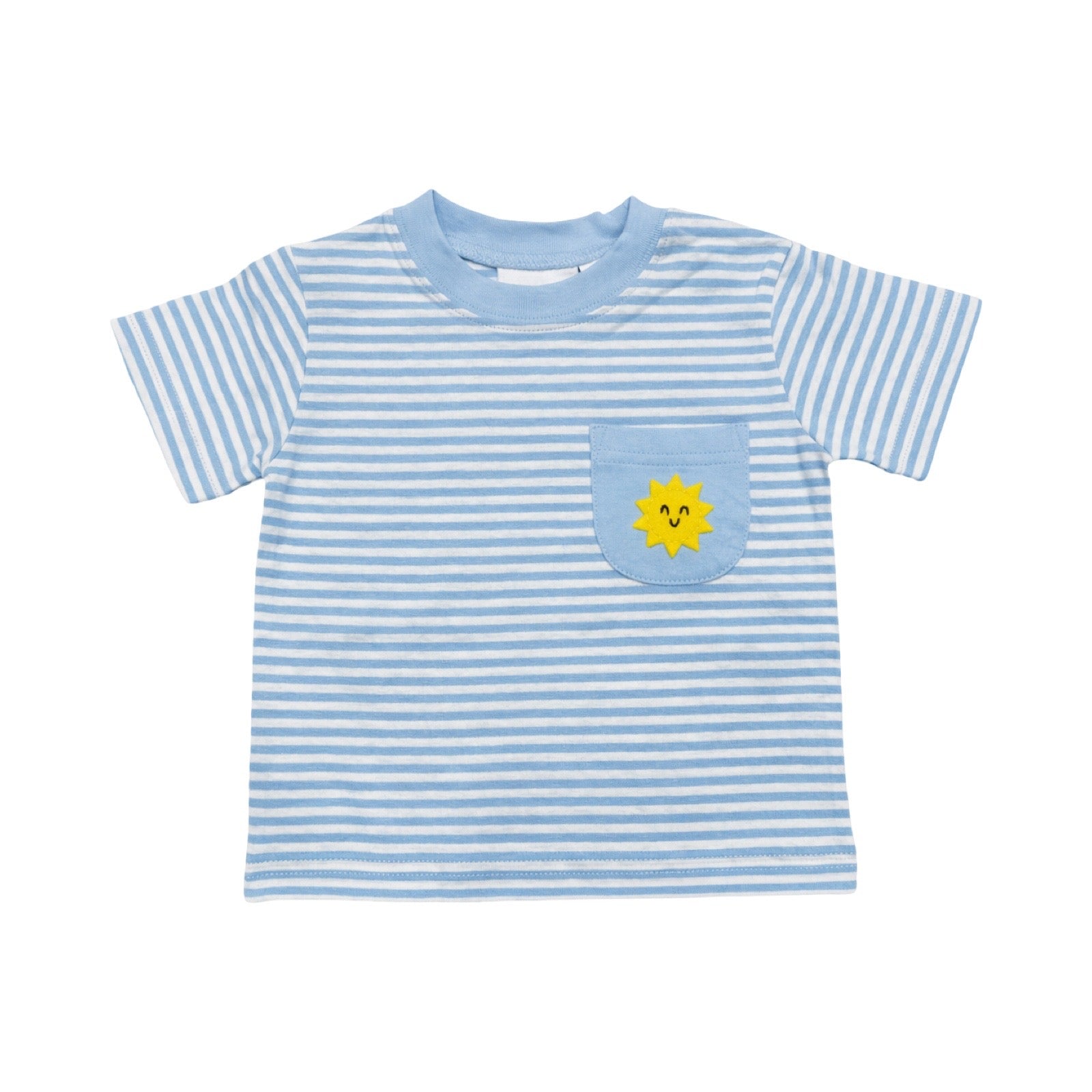 Brighten any day with this adorable striped pocket tee featuring a cheerful sunshine applique. The classic stripe pattern pairs perfectly with the sunny accent, creating a look that's both timeless and full of personality. Soft, comfortable fabric makes it ideal for playtime or everyday wear. A wardrobe essential that brings smiles and style together.