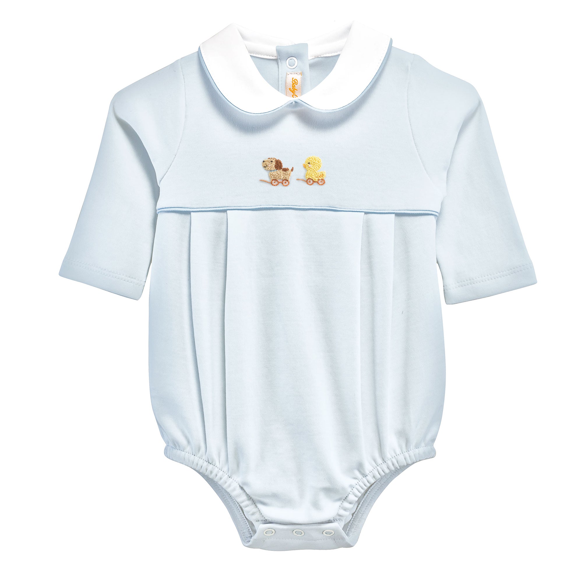Dress your little explorer in the Long Sleeve Embroidered Bubble in sweet toys blue, featuring a charming peter pan collar. This playful outfit combines comfort with sweet detailing, perfect for adventures near or far. Soft fabric and easy movement make it ideal for busy days filled with discovery and delight.