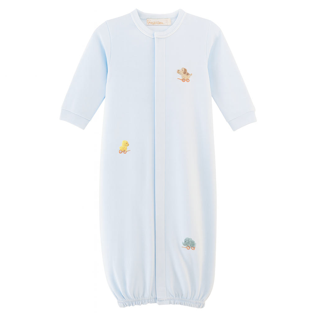 This two in one converter with beautiful hand embroidered pull toys goes from gown to playsuit in just a few snaps.