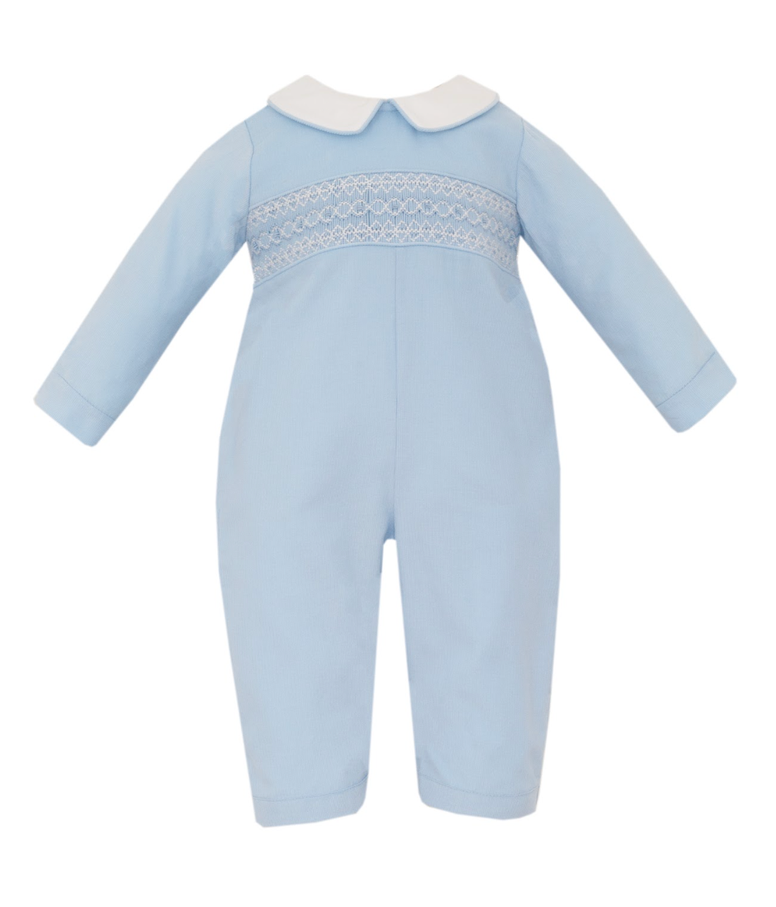 This charming Thomas Blue Corduroy Boy Long Romper brings timeless style with its classic collar and delicate smocking detail. Crafted from soft light blue corduroy, it’s perfect for keeping your little one cozy and looking adorable all day long. Ideal for playdates or special occasions, this romper combines comfort with a playful, vintage-inspired look.