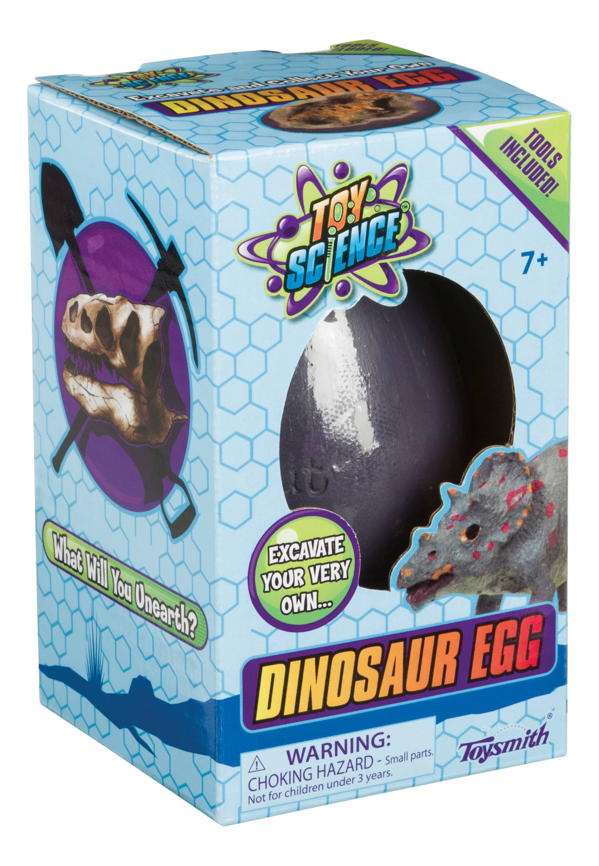 The Toy Science Dinosaur Egg includes 1 colorful 4-inch plaster egg, 1 detailed dinosaur model, a digging stick and brush, and an instructions sheet. Dinosaur sizes and colors vary. Kids can uncover a triceratops, stegosaurus, t-rex, brachiosaurus, velociraptor, or spinosaurus.