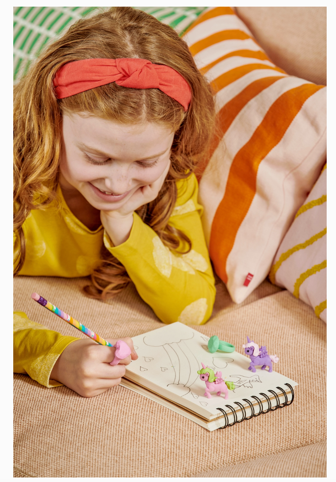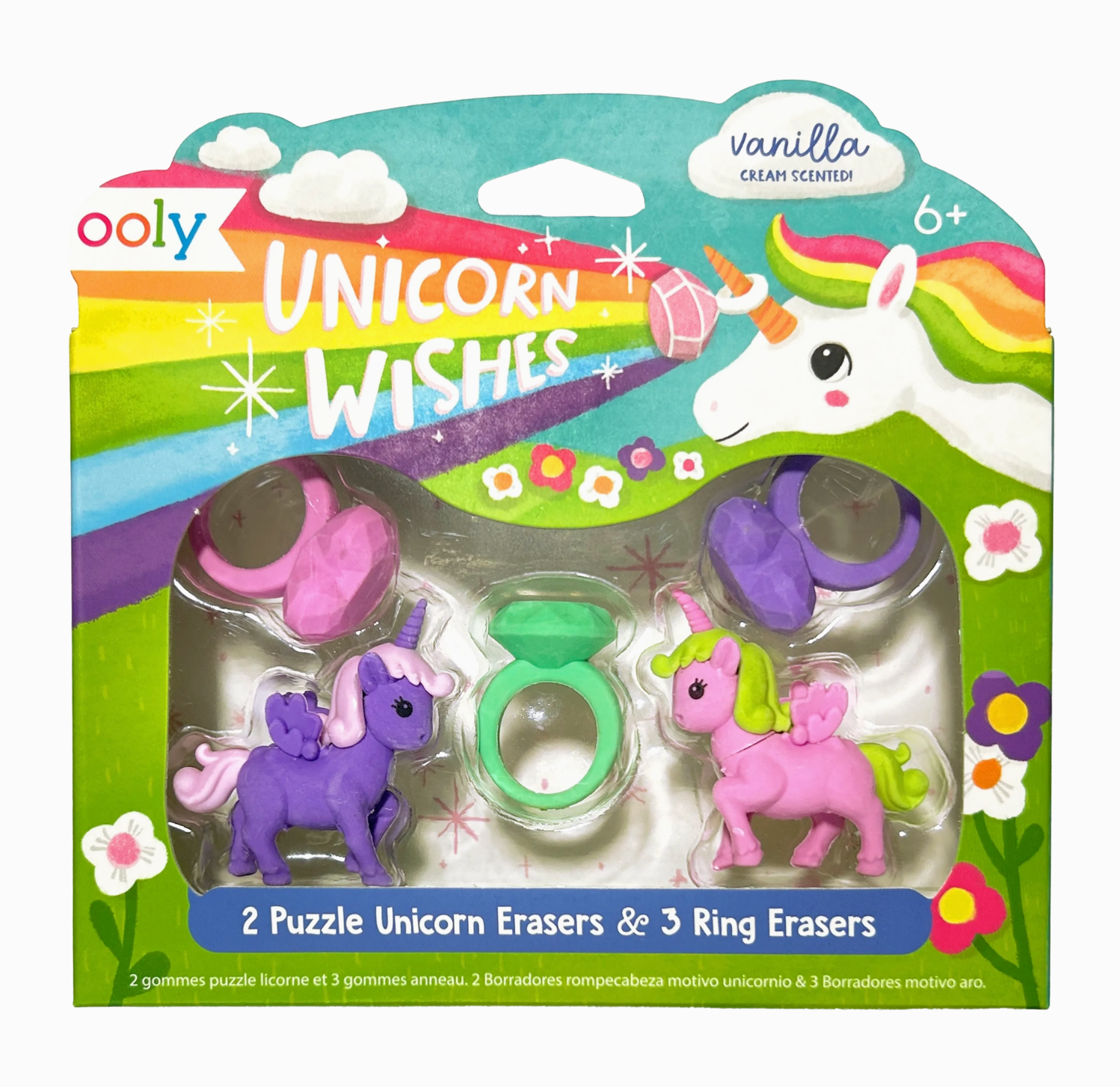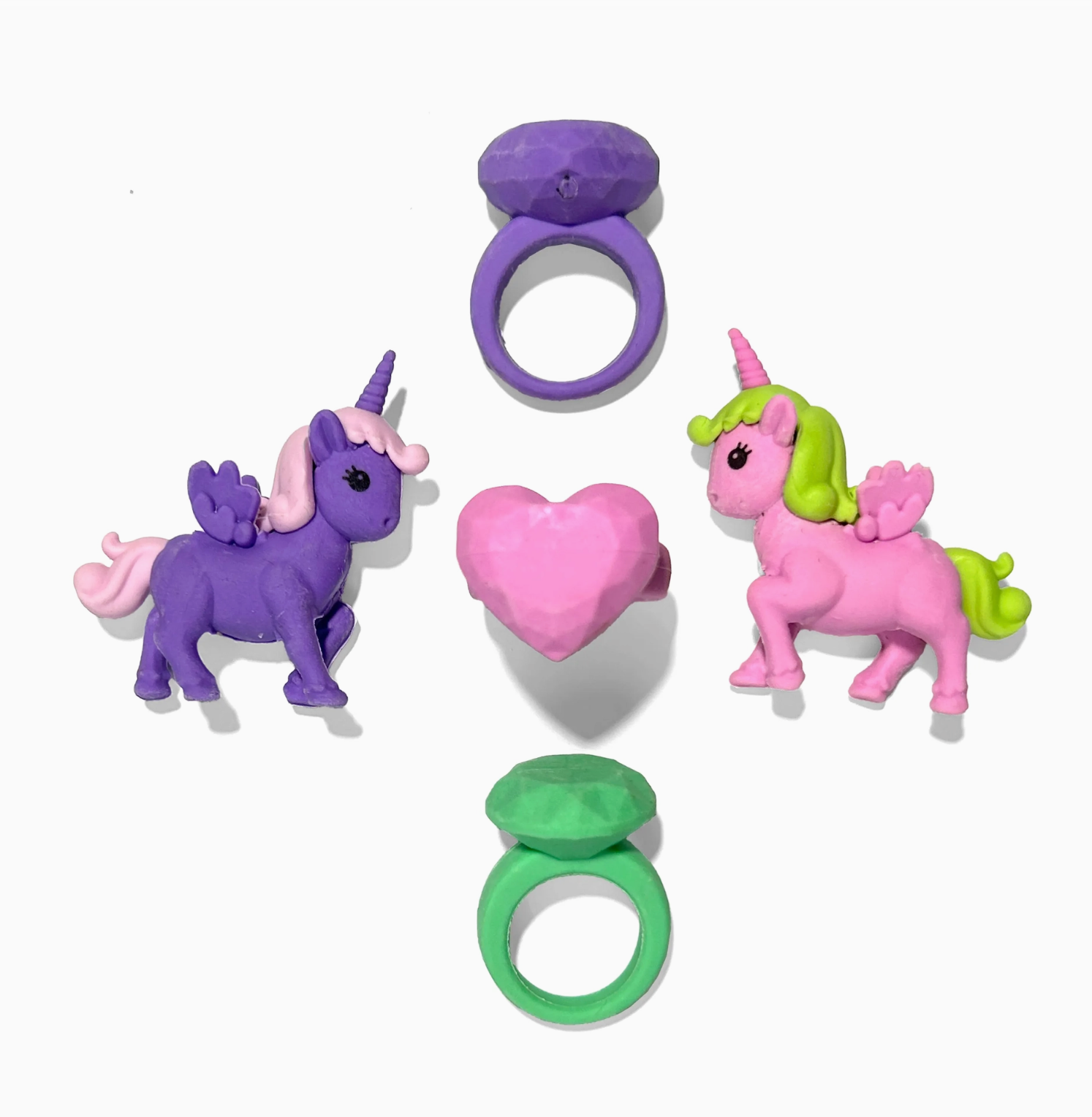 The little details: Set of 5 scented erasers Includes 2 unicorn puzzle erasers and 3 ring erasers Erasers are vanilla scented Erasers are in 5 different pastel colors