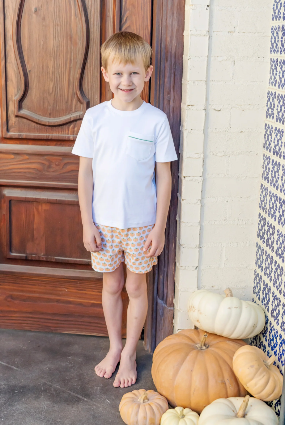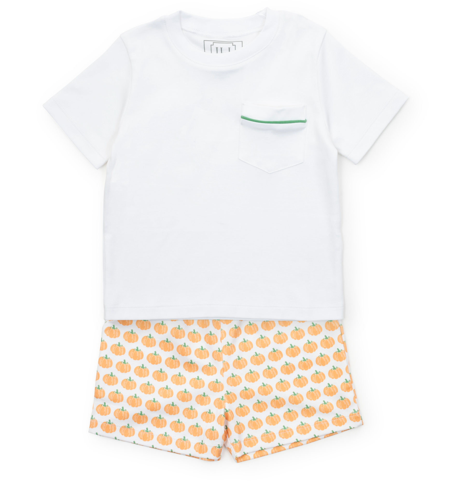 This playful two-piece set features a soft Pima cotton short sleeve shirt in crisp white, accented with a charming pumpkin print pocket. The coordinating knit shorts showcase a festive pumpkin pattern on a cozy background, complete with an elastic waistband for easy wear. Perfect for little adventurers ready to celebrate the season in comfort and style.