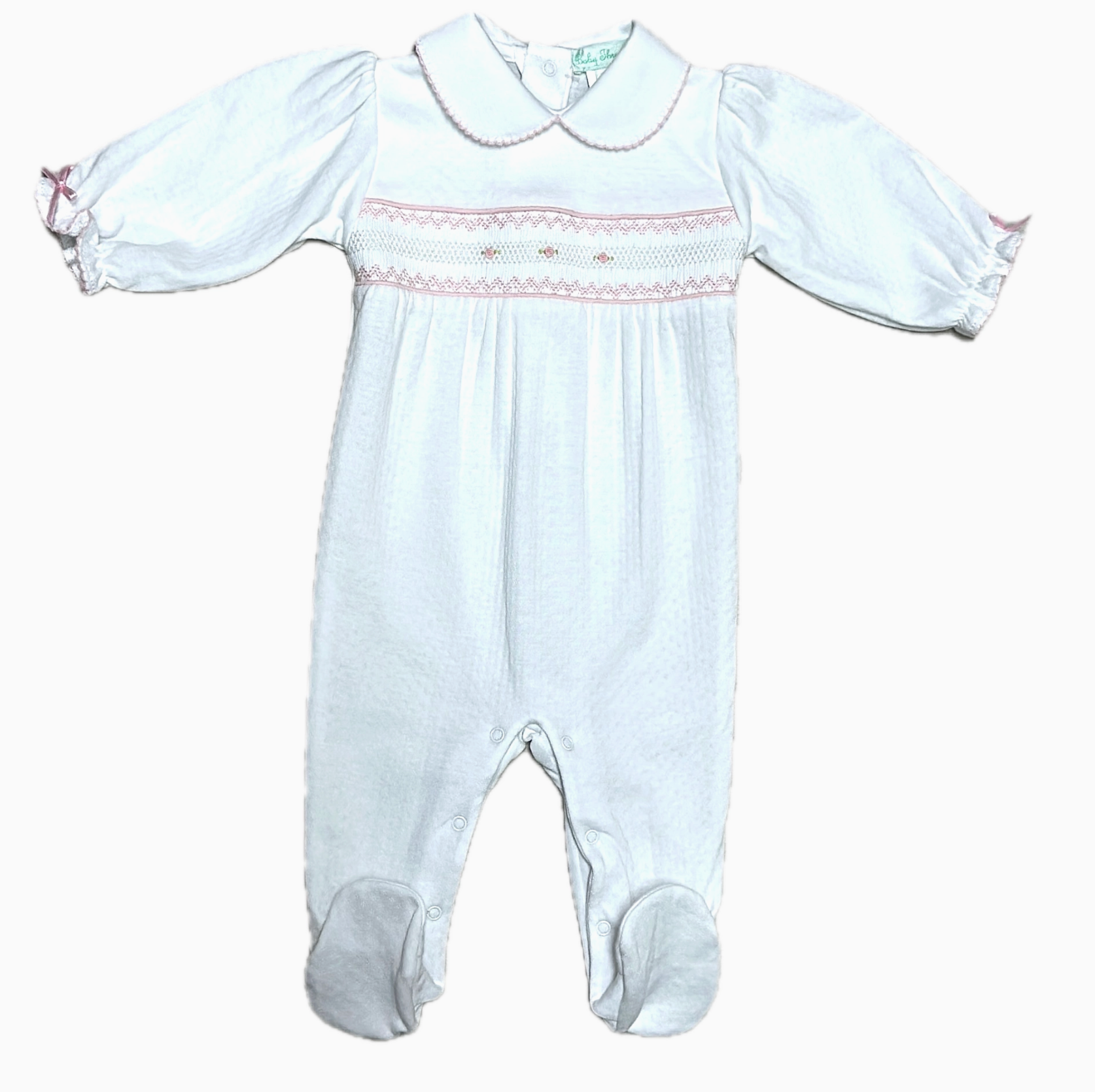 This lightweight pointelle collared footie has a smocked inset across the chest. The pointelle knit fabric with small eyelet holes creates a lacy effect. The hand smocked inset has pink and white details with three precious flower buds. The white peter pan collar has pink picot trim. A small pink satin bow is sewn on each wrist adds a special touch.