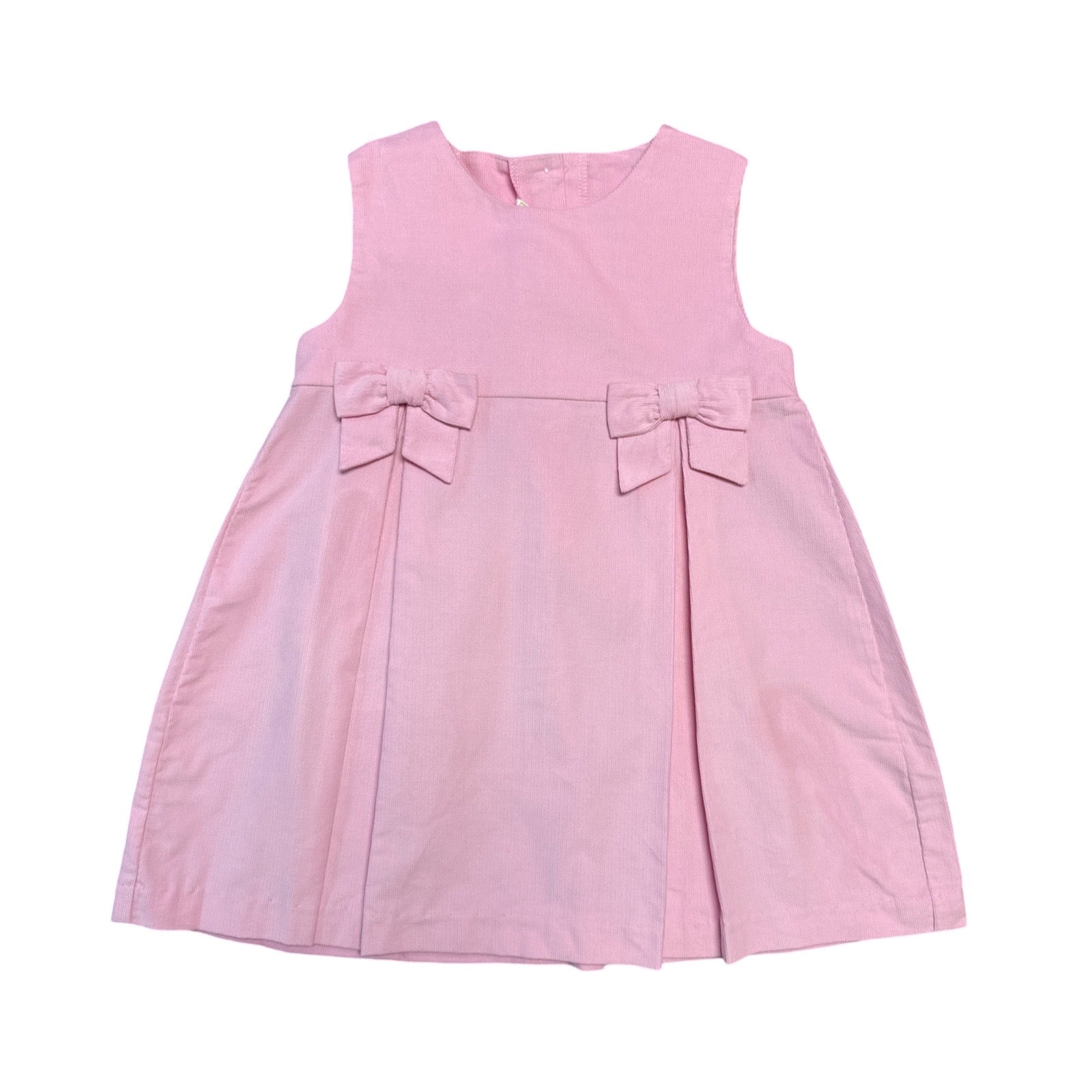 A lovely and classic style, this pink corduroy jumper is an easy choice for your little girls wardrobe. Two sweet bows are added to the front that lead into perfect pleats down the front of the skirt. This jumper layers perfectly over a turtleneck or ruffle neck blouse (sold separately).