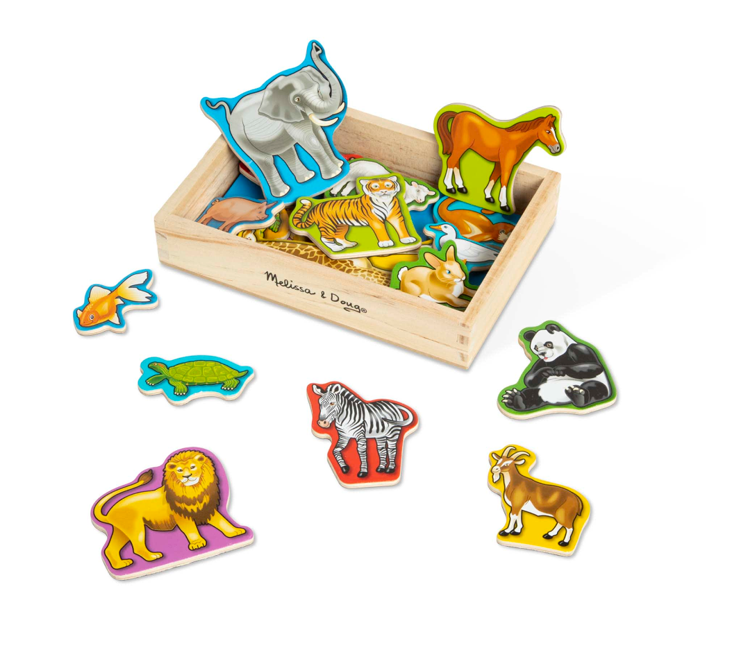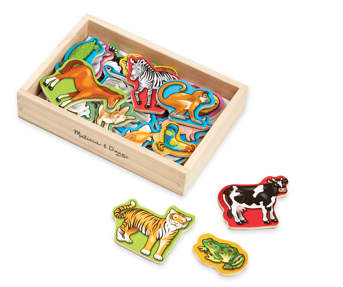Twenty favorite wild and domesticated animals in a compact wooden case are waiting to play.